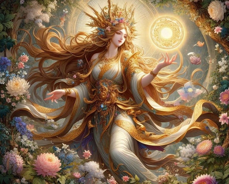 Esthalion, a Deusa da Vida, nasceu do primeiro sopro de vida que percorreu o mundo. Ela é filha de Gaia, a Mãe Terra, e de Eros, o Deus do Amor. Desde tempos imemoriais, Esthalion tem sido a guardiã de todas as formas de vida, desde as menores plantas até os maiores animais. Ela é reverenciada por sua bondade e generosidade, sendo uma figura de esperança e renovação.