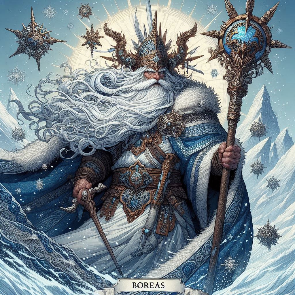 Boreas é um deus antigo e poderoso. Ele é o personificação do vento do norte, trazendo consigo o frio e o inverno. Boreas habita uma caverna no Monte Haemon, na Trácia, de onde ele libera seus ventos gelados para varrer a terra. Ele é conhecido por seu temperamento explosivo e sua força imparável, sendo tanto um destruidor quanto um purificador