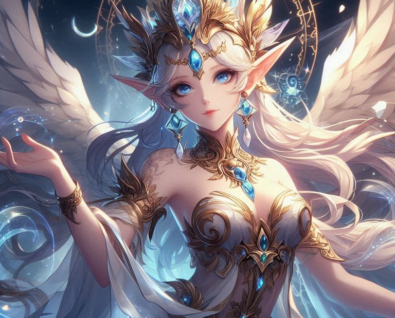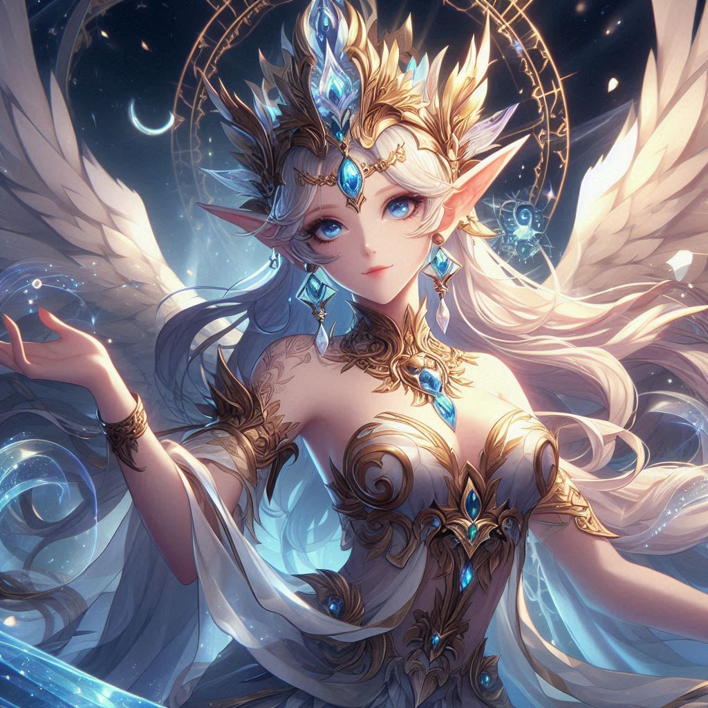 Luminara é a deusa menor do sol, conhecida por sua beleza radiante e presença calorosa. Ela é frequentemente representada com longos cabelos dourados que brilham como raios de sol e olhos que refletem a luz do amanhecer. Sua vestimenta é feita de tecidos leves e brilhantes, que parecem feitos de pura luz solar.