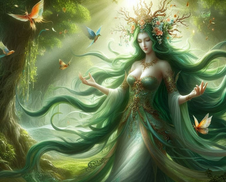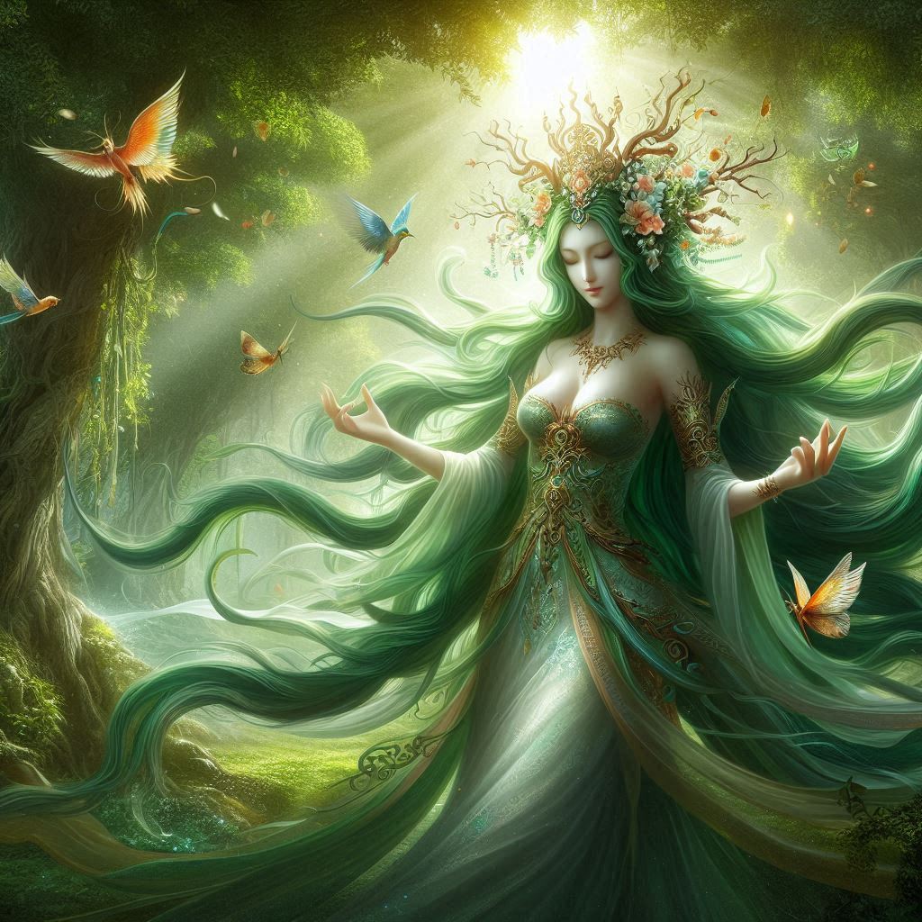 Sylvana é uma deusa antiga, nascida do primeiro broto que surgiu na Terra. Ela é a guardiã das florestas e protetora de todas as árvores. Sylvana é reverenciada por druidas e guardiões da natureza, que a veem como a personificação da vida vegetal. Sua presença é sentida em cada folha que balança ao vento e em cada raiz que se estende pelo solo.